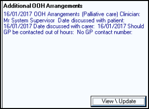 Additional Out of hours arrangements for the patient are displayed here if recorded, if no OOH arrangements have been recorded No data recorded displays: