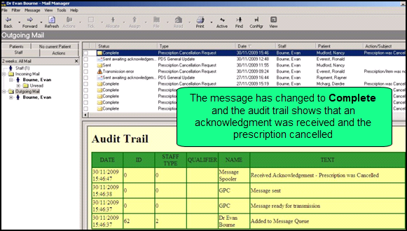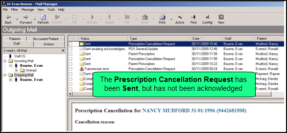 When an electronic prescription is cancelled, a message is transmitted to the Electronic Prescription Service in a Parent Prescription Message. On receipt of the cancellation request message, an acknowledgement is sent back to Vision which automatically updates the message in Mail Manager to Complete.