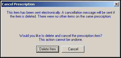 - From the Therapy screen, right click on the item and select Delete. The This item has been sent electronically. A cancellation message will be sent if the item is deleted. There were no other items on the same prescription. Would you like to delete and cancel the prescription item? This action cannot be undone. message displays. If there are other items on the same prescription, they are listed in the message and you can select to delete the individual item or all the items on the prescription.