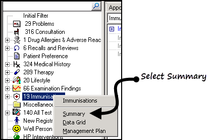 , select the patient and start a consultation if required. - From the navigation pane, right click Immunisations and select Summary.