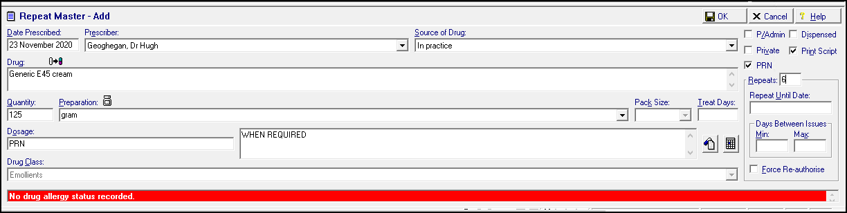 - Repeats - Enter the number of repeats you are authorising, this cannot be greater than your personal Repeat Limit, see Consultation Manager Setup - Therapy for details.