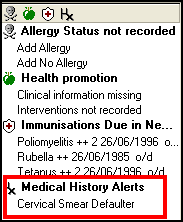 A Medical History Alert is created in the Alerts pane in Consultation Manager for defaulter SCCRS exclusions. This acts as a warning that the patient has been excluded from the Smear recall system for a certain period of time.