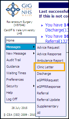 , select Summary - WCCG to log into the WCCG in the usual way.Remember - If you select a patient in Consultation Manageryou are initially offered their details within WCCG, if you have no patient selected in Consultation Manageryou can initially see messages for all patients within WCCG. - From the WCCG menu, select Messages - Clinic Letter: