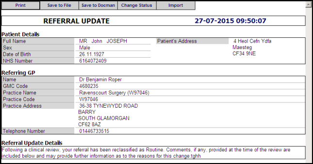 - The Referral Update displays in Consultation Manager having been received and filed via Mail Manager: