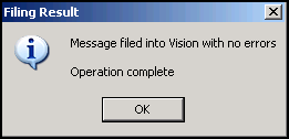 - The 'Message files into Vision with no errors, Operation complete' message displays, select OK:
