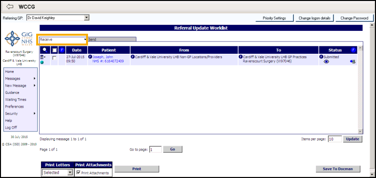 - The Referral Update Worklist displays, select the Receive tab and select the message you require:
