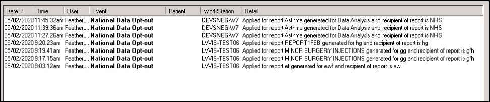 If you use any aspect of the National Opt-out filter in a search, the resulting search is recorded in the Event Log.