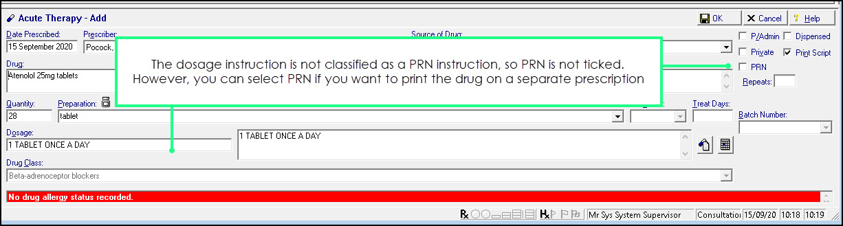 Adding a drug with an As Needed dosage instruction automatically selects a PRN option on Therapy Add, this can however, be deselected.