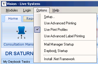 From the Vision front menu, select Options - Advanced Printing. This ticks Advanced Printing to show it is selected, and the menu option Use Print Profiles disappears.