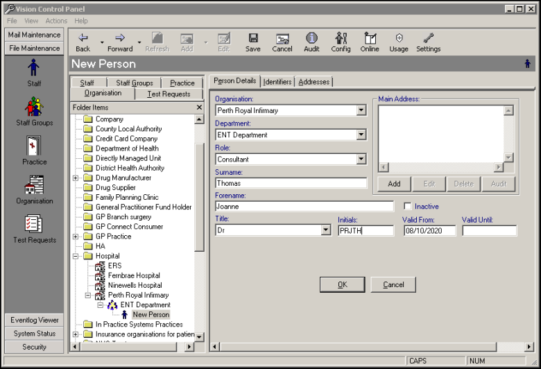The same principal can be used to enter other medical staff, or non-medical staff, attached to an organisation, for example, a social worker attached to Social Services organisation. In fact Person can refer to any external people, not directly employed by or attached to the practice.