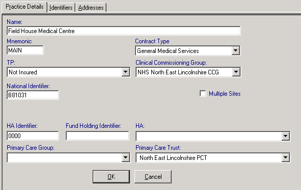 - Click OK.Note - Once you have entered details for the main surgery, right clicking and selecting Add Practice will let you add a branch surgery.