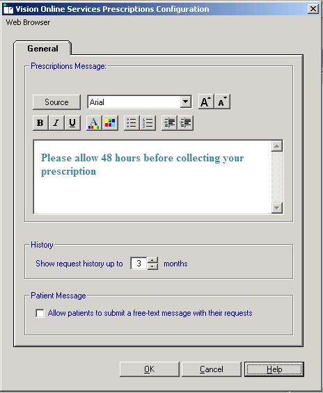The prescription message entered here displays on all Online Prescription pages on the website.