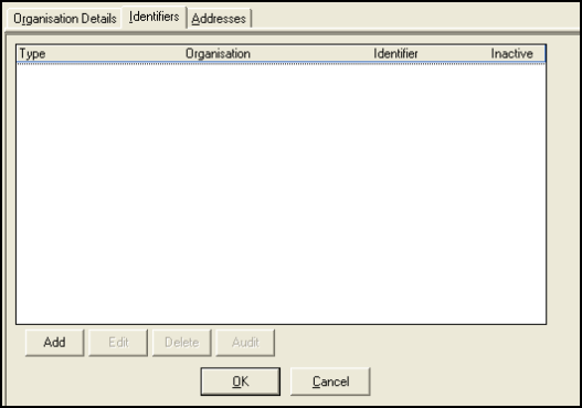 You must enter an organisation code for the hospital in Identifiers. Select the Identifiers tab.