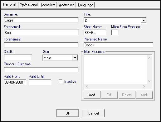- Inactive - Tick to indicate the doctor is no longer active, and no longer appears on selection lists of active users. Any historical records still bear the initials of a former GP for audit purposes. For example, a GP registrar leaving the practice should be made Inactive, see Inactivating a User for details.