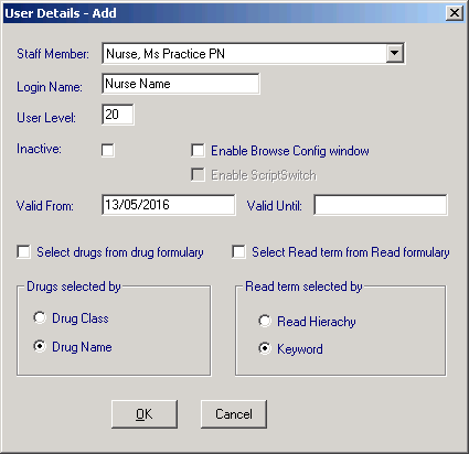 - Read term selected by - Choose either Read Hierarchy (ie by code) or Keyword as the default way this user will select items from the Read Dictionary. You can switch between the two at the time of selection.