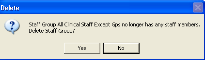 As this leaves the group empty, you are asked: Staff Group [name] no longer has any staff members. Delete Staff Group? Answering Yes deletes the group, but it is perfectly valid to answer No and leave an empty group between sessions as it may be needed subsequently.