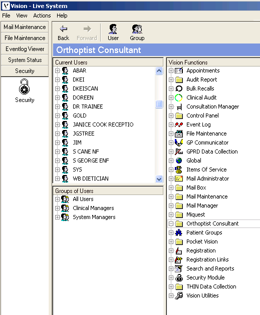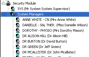 In essence, any group that is placed immediately beneath a module heading has access to everything within that module. So if a heading has the group All Users immediately beneath, then all users can access that module. Some modules have Clinical Managers and others, System Managers.