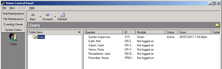 Sytem Status consists of two folders, this enables you to view the current status by workstation or by user. This includes a list of all users currently logged on, and which patients they have selected.