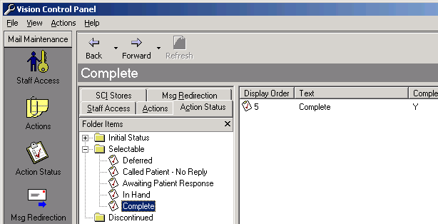 Once an action has been assigned to a message (see Actions), it may go through a number of stages prior to the action being marked as complete. At each stage, the responsible user may wish to update the status of the action. Such changes to the action status are coded in a similar way to action codes to render them searchable. An unlimited number of status codes may be defined by an individual practice although, in practice, the smaller the number, the more manageable the list.