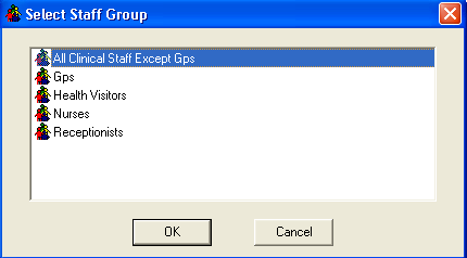 - This lists all the current Staff Groups set up (see Staff Groups on page ). On selection the group will be added and selected.