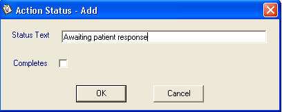 Completes - Each action has the concept of being outstanding or complete. The status further qualifies the outstanding state but application of a particular status code may implicitly complete the action. For instance, an action of Make an appointment with a status code of Appointment made is implicitly complete. If the Completes flag is set on the status, then the action will automatically be completed. Note that Completed does not necessarily mean completed successfully and numerous status codes may mark an action as complete even though it has not been successfully performed.