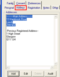 For practices in England using their Smart cards, the previous address is taken from the National Spine. For other areas, or where the Spine is not used the address can either be taken from the previous address on the Family tab or from the details of the new patient Registration.