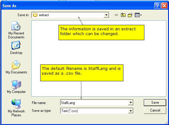 - The Save As screen defaults to the extract folder where the file will be saved, unless changed. The file name is StaffLang and is a csv file, but this information can be also be changed.