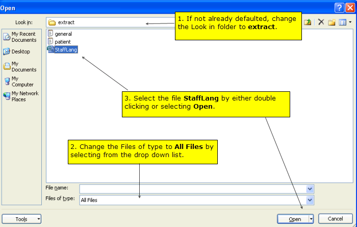 The file can be opened in Excel by selecting Open. Change the 'Look in' folder to the extract folder and change the 'Files of Type' to All types. Highlight the file StaffLang and click Open.