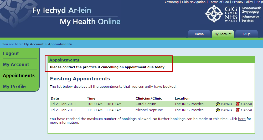 This is a practice specific message which displays on each Online Appointments web page. This message must be added in Welsh (for the Welsh version of the website) and English (for the English version).