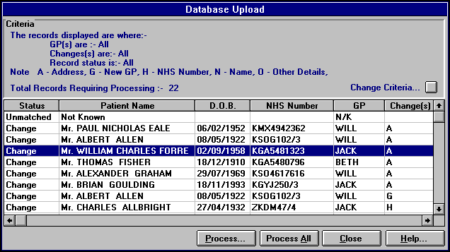 - Process All - To process all the records at once, all amendments are automatically processed, except unmatched and rejections, and are applied to the patient's Registration record. If any patient record is in use on the system, a Locked Details message displays when that patient is reached, and the patient's change is not processed.