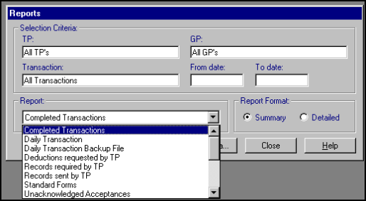 under Report to display the various transaction type report options. Select your selection. The options from the Reporting menu are:- Completed Transactions, Daily Transaction Summary, Daily Transactions Backup File, Deductions requested by TP, Records required by TP, Records sent by TP
