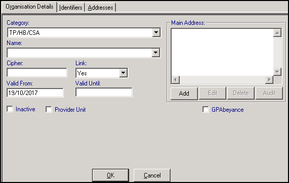 - Valid From and Valid Until - (Optional) Valid From defaults to today's date. This is the start date of the association of the Organisation with the practice. If in the future you finish your association with the TP, you can either enter a Valid Until date and tick Inactive, or right click on the TP in the tree view and select Remove Organisation, this does not actually remove it but makes it inactive.