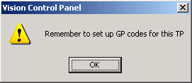 - The 'Remember to set up GP codes for this TP' displays, select OK.