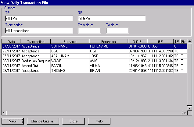 - The top part of the screen displays the TP, GP, Transaction and a date range, the default is all for each category. This can be changed by selecting Change Criteria,see Change criteria for details.