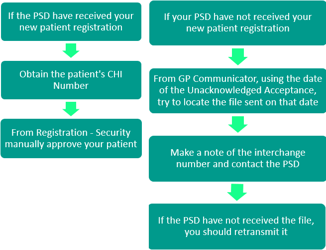You should view your Unacknowledged Acceptances on a regular basis to make sure all new patients have been accepted. For patients who have been registered for more than a week and are still in this file, you should contact PSD to see if they have received the registration. Below is a summary of what you need to do: