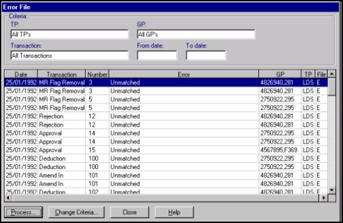 Any incoming transactions from your TP that cannot be matched to one of your patients is placed in the Error File as an Unmatched transaction. The error does not show the patient's name so before dealing with the error you need to identify the patient by searching on their NHS/H+C/CHI number or Date of Birth.