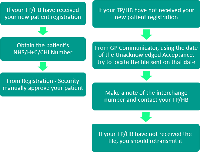 You should view your Unacknowledged Acceptances on a regular basis to make sure all new patients have been accepted. For patients who have been registered for more than a week and are still in this file, you should contact your TP/HB to check they have received the registration. Below is a summary of what you need to do: