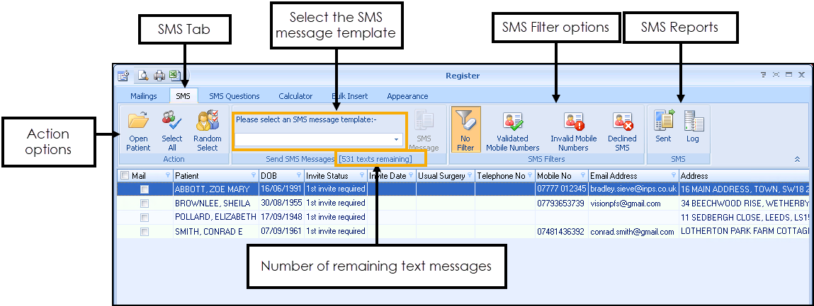 - Send SMS Messages (nn Texts Remaining) - Lists the number of remaining text messages.Note - For practices in England that have an Integrated Care Board (ICB) EE contract, the send SMS messages is maintained automatically for you and displays the message 'EE providing texts'.