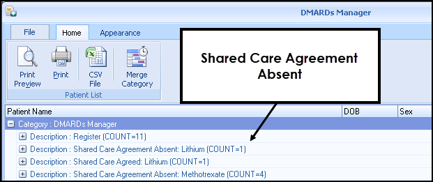 - The reports show the DMARD drug and displays a count of patients with and without a Shared Care Agreement.