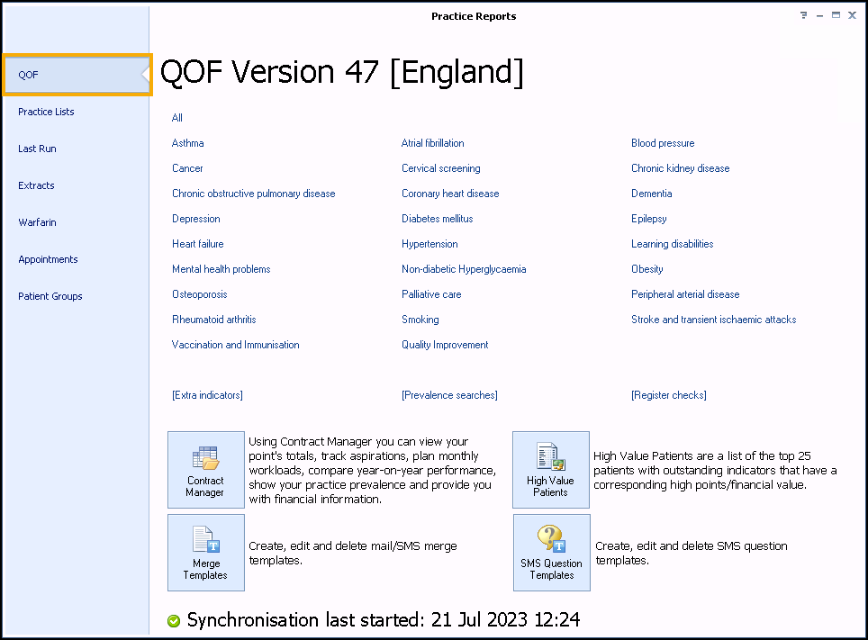 Training Tip - QOF stands for Quality and Outcome Framework (England, Scotland and Northern Ireland). QAIF stands for Quality Assurance and Improvement Framework (Wales).To select a different report select one of the following menu options on the left hand side: