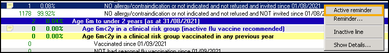 Audit lines with pale yellow reminders have inactive reminders. You can choose which reminders you want to activate before you generate the new audit, after generation reminders display as yellow post-its on the relevant patient record within Consultation Manager.