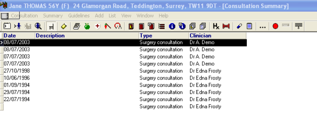 • Either click on the required earlier consultation to highlight it, then select Consultation - Open Existing Consultation to open the consultation (but only if any current consultation is closed). Remember you can always check which consultation is currently open from the information displayed on the Status bar line at the bottom of the screen. Select Close Consultation when finished.