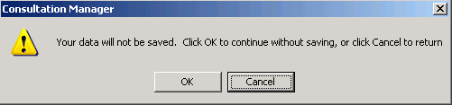 If you press cancel or the escape key on any open data entry form in Consultation Manager (including reminder and patient warning forms), you are prompted with the following option: "Your data will not be saved. Click OK to continue without saving, or Click cancel to return." This prevents forms from being accidentally cancelled and lost.