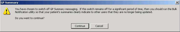 - You are prompted "You have chosen to switch off GP Summary messaging. If this switch remains off for a significant period of time, then you should run the Bulk Notification utility so that your patient's summaries clearly indicate to other users that they are no longer being updated. Do you want to continue? Click Continue.
