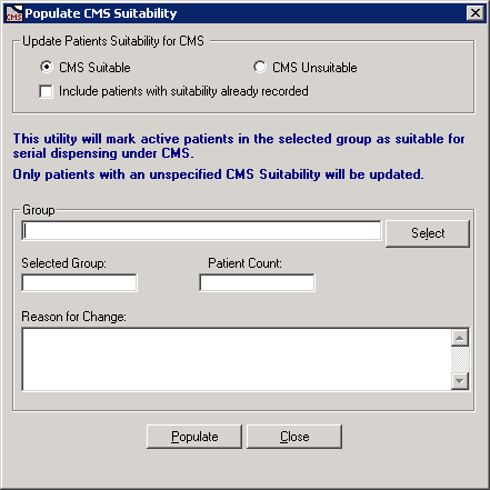 The Populate CMS Suitability function allows you to mark patients as suitable or unsuitable within a specific patient group. You might like to review your chronic disease registers for patients potentially suitable for CMS (Serial Prescribing). You can use the Clinical Audit audit groups to identify chronic disease patients and merge the groups together to create a definitive list of all chronic patients. You might also like to add a reminder to the flagged patients. The best way to do this would be to run the CMS Suitability report (see Report Output) and save the results to a group so that you can bulk add reminders from patient groups.
