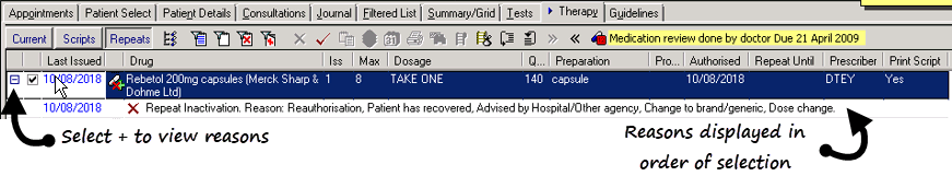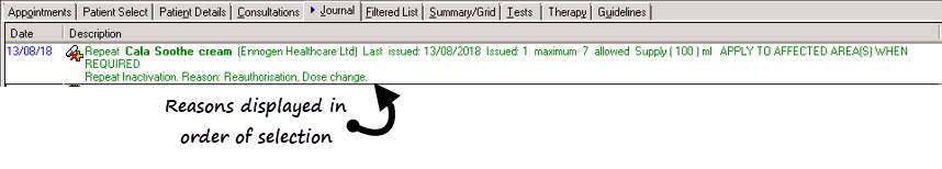 Inactivation and Reauthorisation Change Reasons are displayed in the order they were selected, followed by any additional comments indicated by <<text here>>. For a reauthorisation, the first reason is always Reauthorisation. Recorded reasons can be viewed from Consultation Manager: