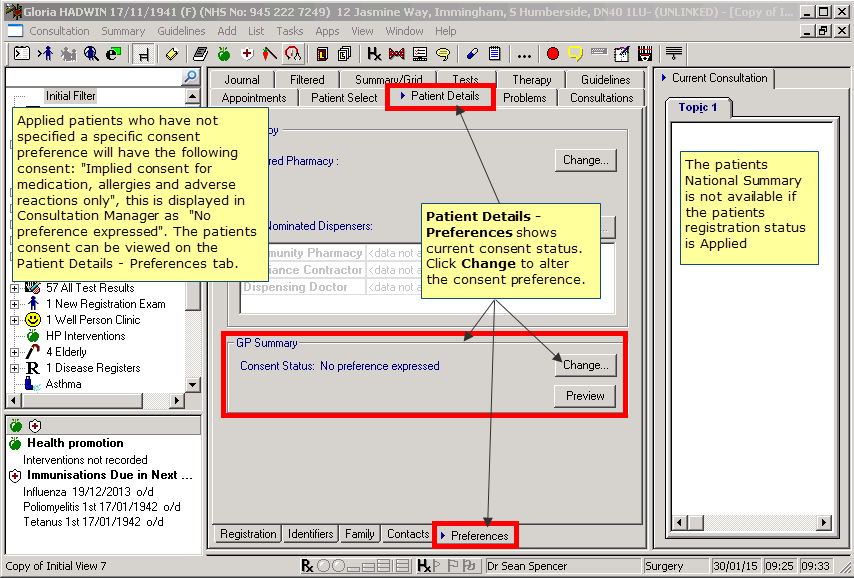 Whilst the patient is "Applied" their consent status can be updated, however, this is not sent to the Spine until the patient's record is next selected once they are "Permanent". If no consent preference is recorded for the patient implied consentis assumed, it displays as "No Preference Expressed" in Consultation Manager. When permanent the patient's SCR contains core data only.