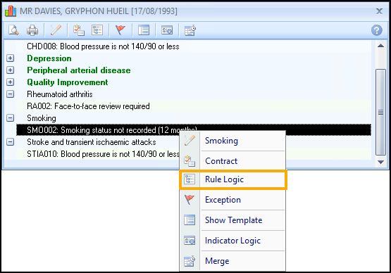 The Rule Logic screen displays the words AND/OR making it perfectly clear what is expected. In this example, the Rule Logic tool for SMO0052 - Smoking status not recorded shows one of the five conditions listed must be met: