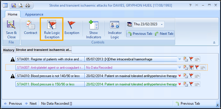The Rule Logic Exception tool works in similarly to the Rule Logic tool. The only difference is the Rule Logic Exception tool is a visual representation of which Exception clinical terms need applying to the indicator in order to completely except the patient from the Indicator/Category.