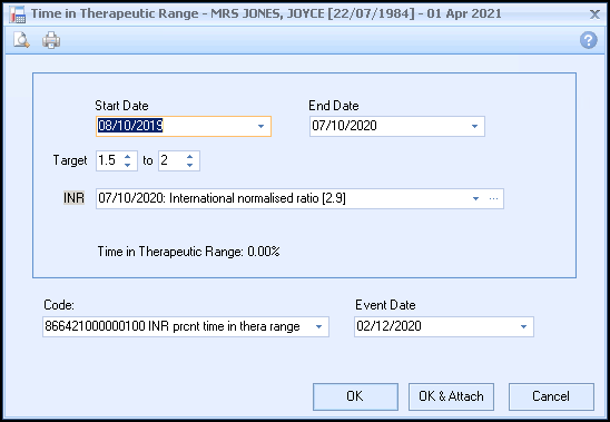 measure (expressed as a percentage) assesses the mean therapeutic INR range for patients who have sufficient INR values. It provides vital information about whether the patient is benefiting from taking Warfarin. The calculator scans the patient's record for INR values, ignoring the first 6 weeks of results after Warfarin indication setting the start date to the first INR after that date and the end date to the last INR after that date. A warning occurs if the patient does not have a minimum of 6 months results but a calculation will still be completed. It then uses the therapeutic range which defaults to the range saved against the patient (usually 2-3), to calculate the percentage assuming that changes between consecutive INR measurements are linear over time.